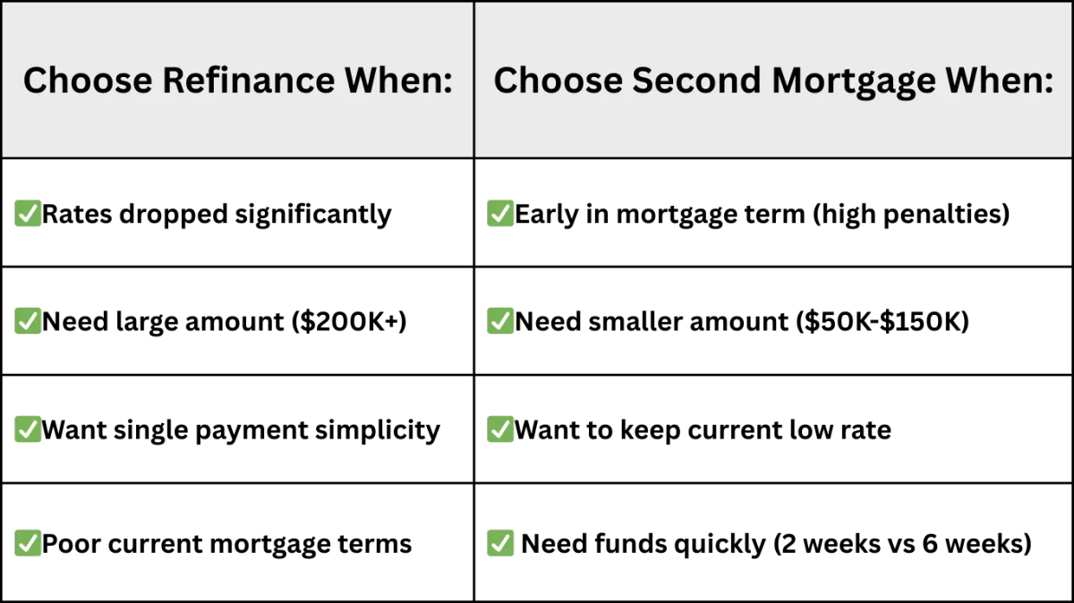 Refinancing replaces your existing mortgage, while a second mortgage keeps it intact. The right option depends on penalties, timing, and cash needs.